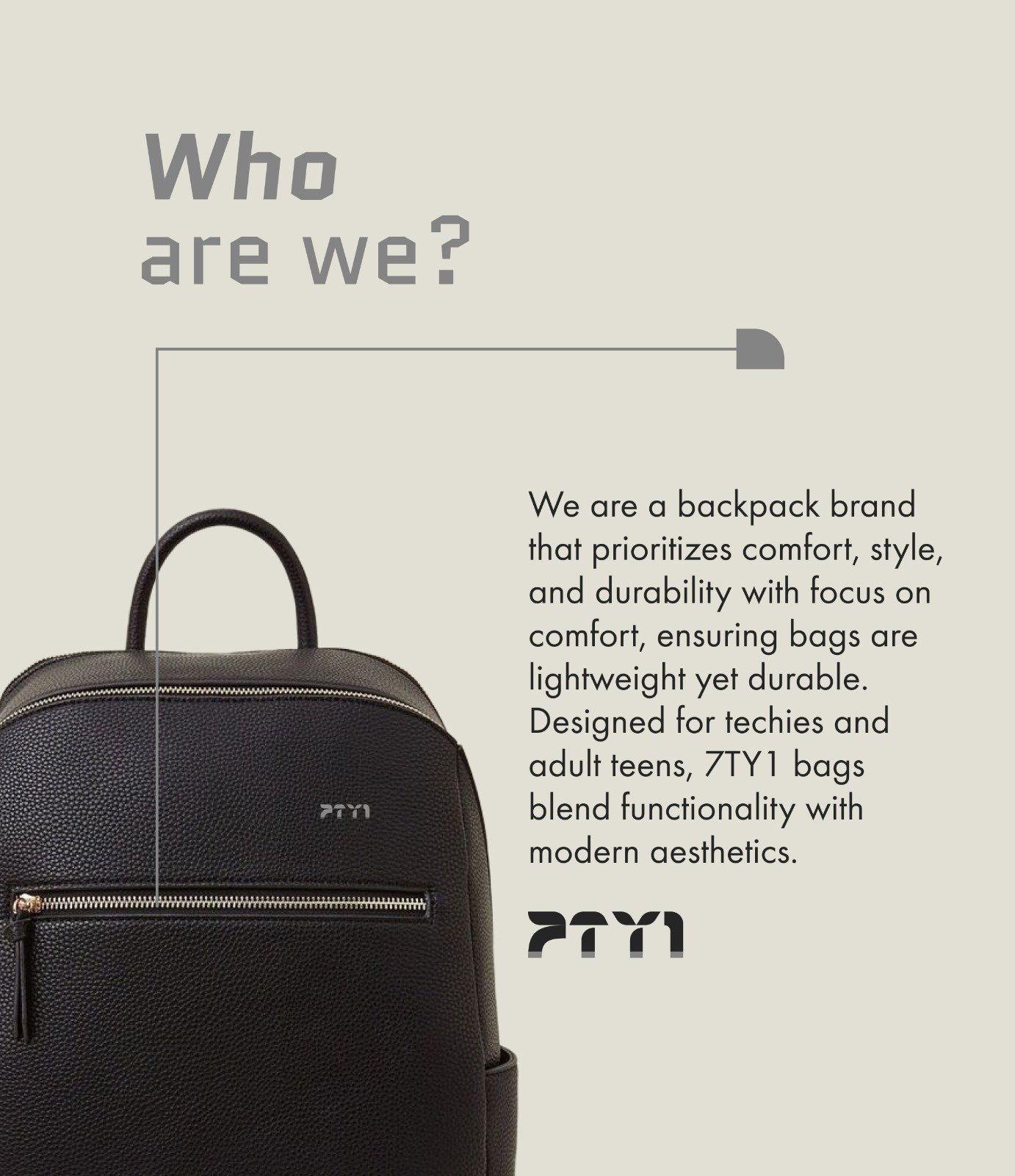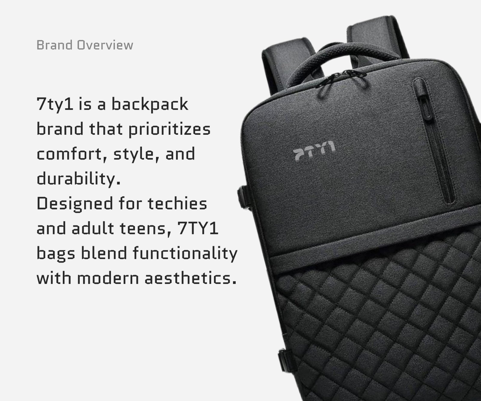7ty1 is a backpack brand that prioritizes comfort, style, and durability. The brand is designed for techies and adult teens, our bags blend functionality with modern aesthetics.