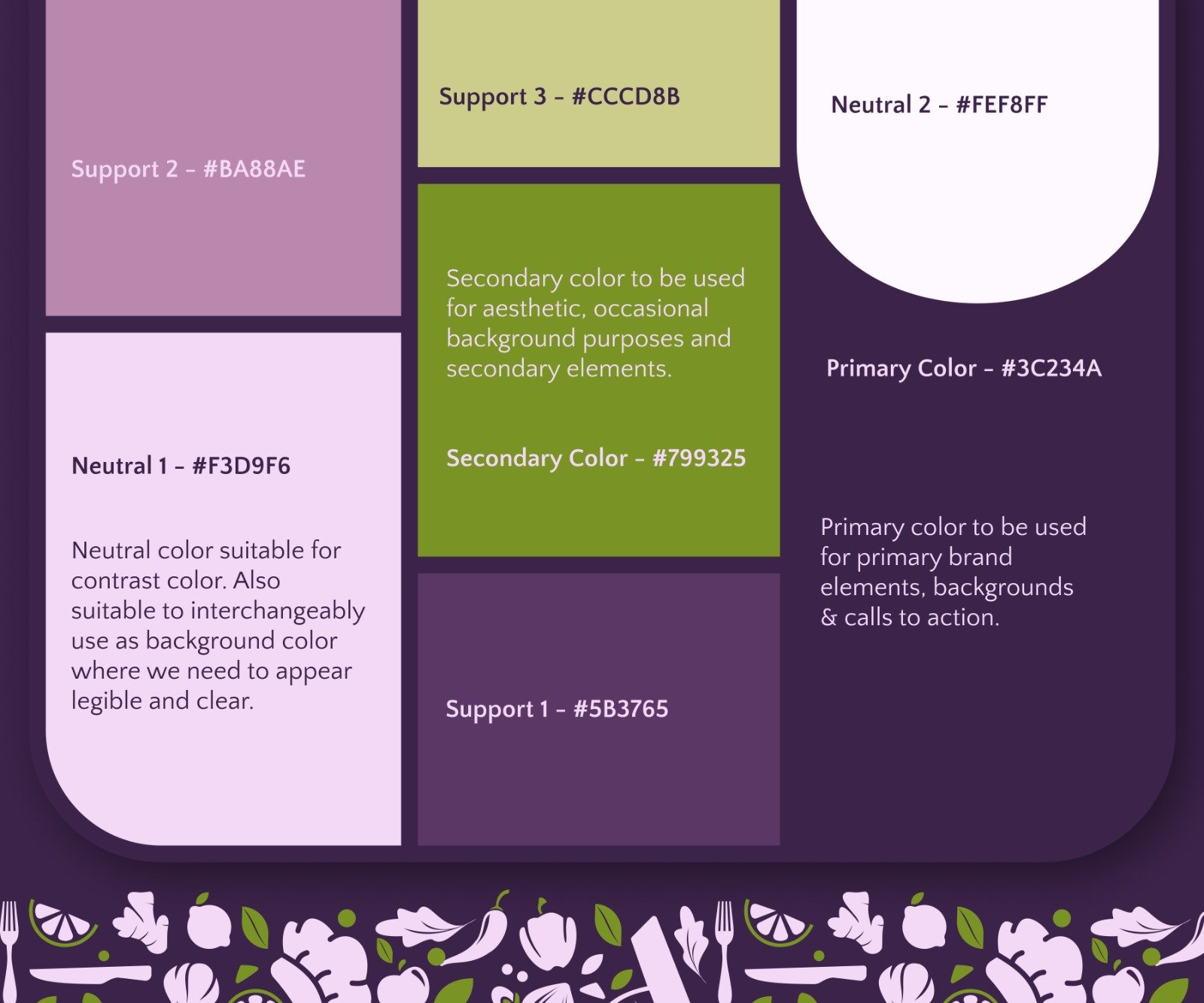A clean and expressive typeface was selected to balance warmth with confidence while supporting patterns inspired by food and kitchen elements were used across brand assets to create a cohesive and delightful visual experience.